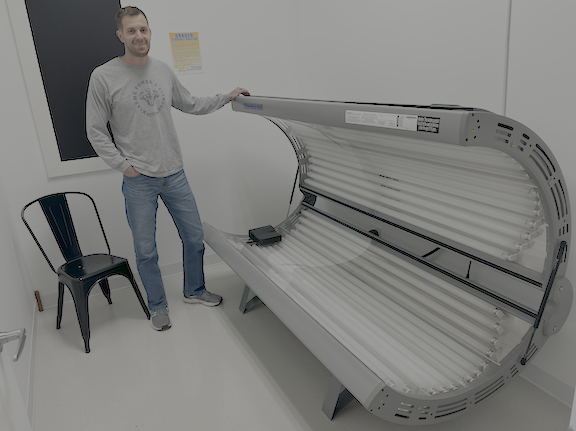 Anthony Swed is shown with one of the five new tanning beds in his facility. [Photo by Michael Berry]