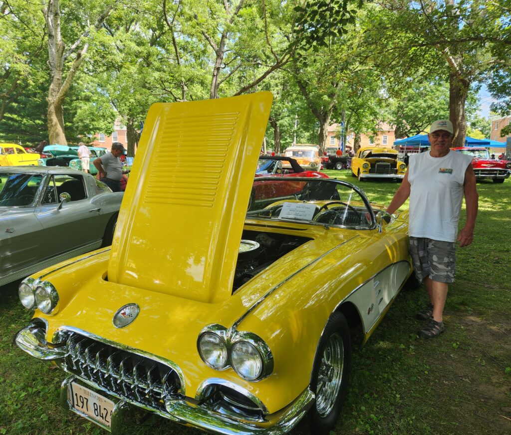 Jerry Bent, from Oneida, showed off his bright yellow 1959 Chevy Corvette Convertible, one of several cars in his collection.