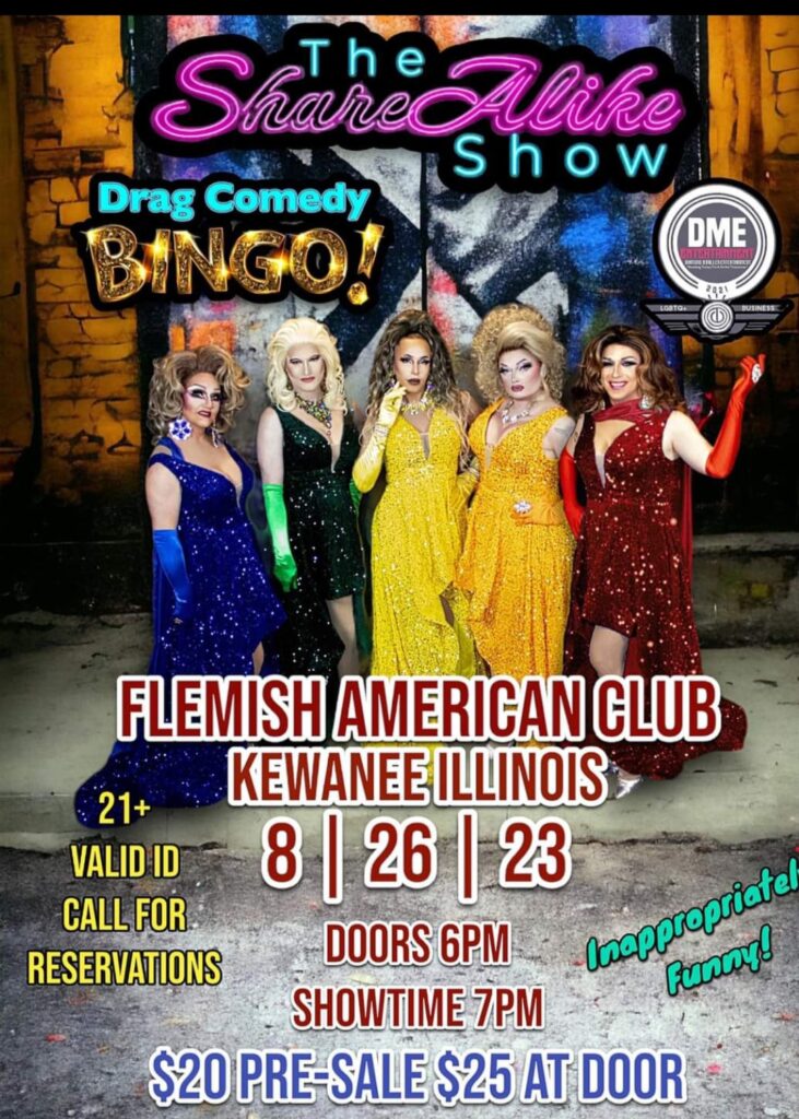 For one night only, The Share Alike Show will present a Drag Comedy and Bingo to be held at the Flemish American Club located at 313 N. Burr Blvd. in Kewanee.