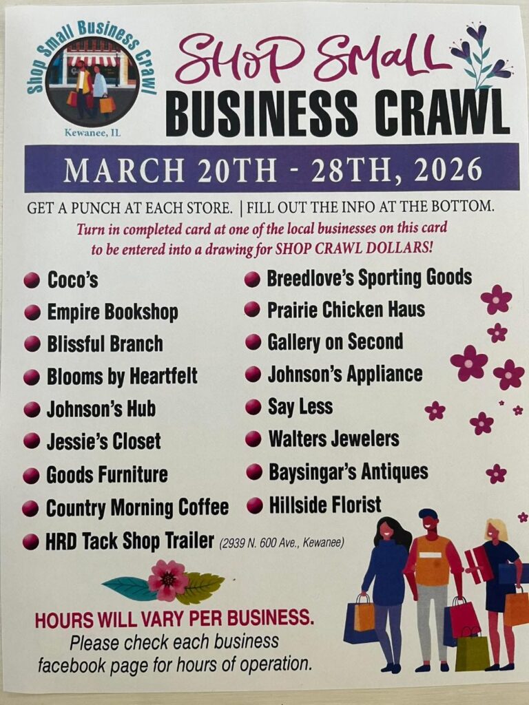 This weekend Kewanee businesses will have a “Shop Small, Business Crawl” from March 20 through the 28.