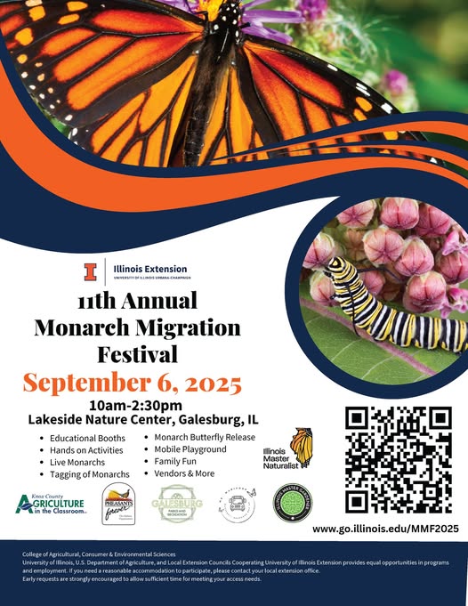 The Lakeside Nature Center’s Monarch Migration Festival from 10 a.m. – 2:30 p.m. at 1033 S. Lake Storey Rd. in Galesburg