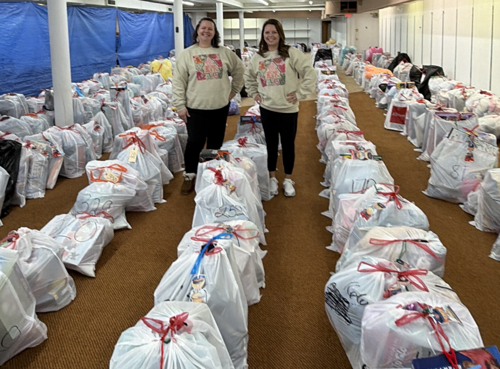 Heather Dana, left, and Amber Patch Troxell are shown on the lower floor of the Salvation Army with some of the bags of toys that were distributed last month to local children through the annual Patchy’s Toy Drive. [Submitted photo]