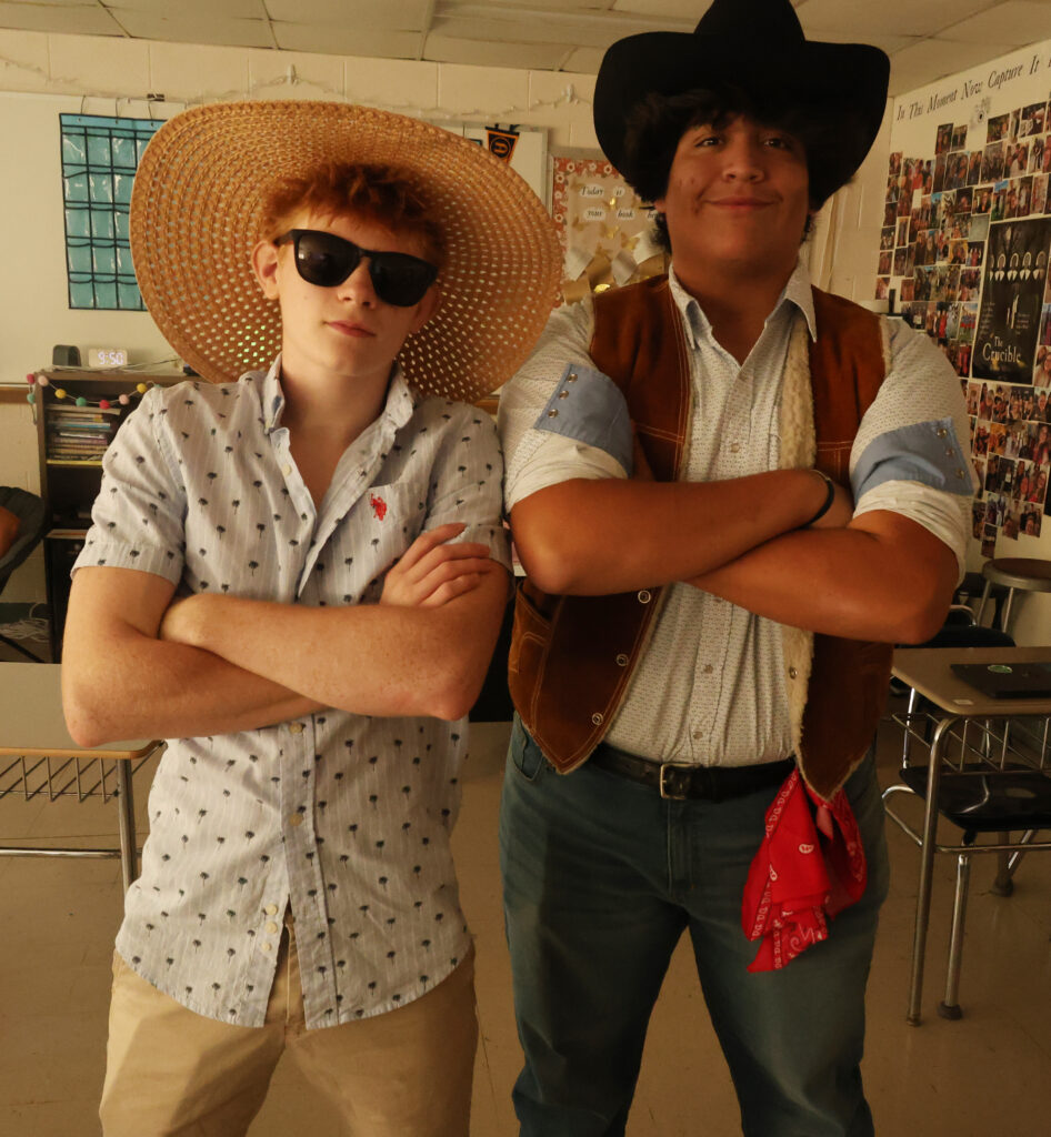 Junior Hunter Vancil (left) blends Tuesday’s theme together while senior Mikey Gamez (right) shows off his wild west style.