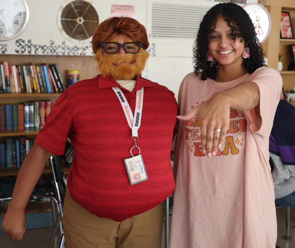 Itzel Mosso Ramos (left) and Ra’Kiya Amos (right) dressed up as Jared Hahn, special ed. instructor, and Katherine Streicher, junior English teacher. Hahn and Streicher are engaged, so their impersonators played the part, too. [Photos courtesy of Kewanee High School]