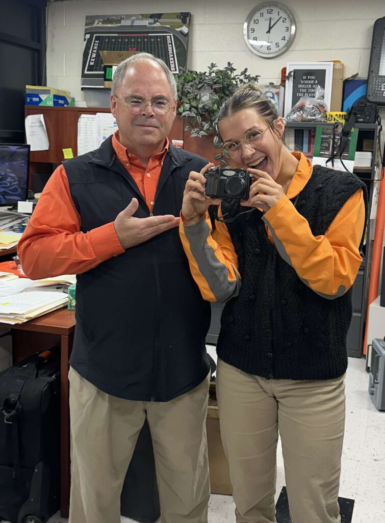Driver’s ed instructor and athletic director Tim Atwell doesn’t have much faith that his impersonator, sophomore Bailey VanWinkle, is ready to take on photography, one of the many hats he wears at Kewanee High School.