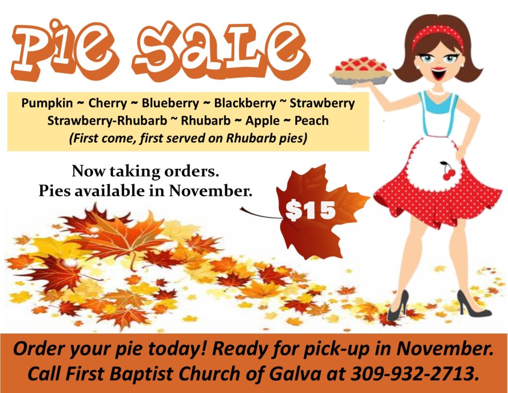 The First Baptist of Galva, located at 211 NW 4th Ave., is taking orders for pies. The pies will be available in November.