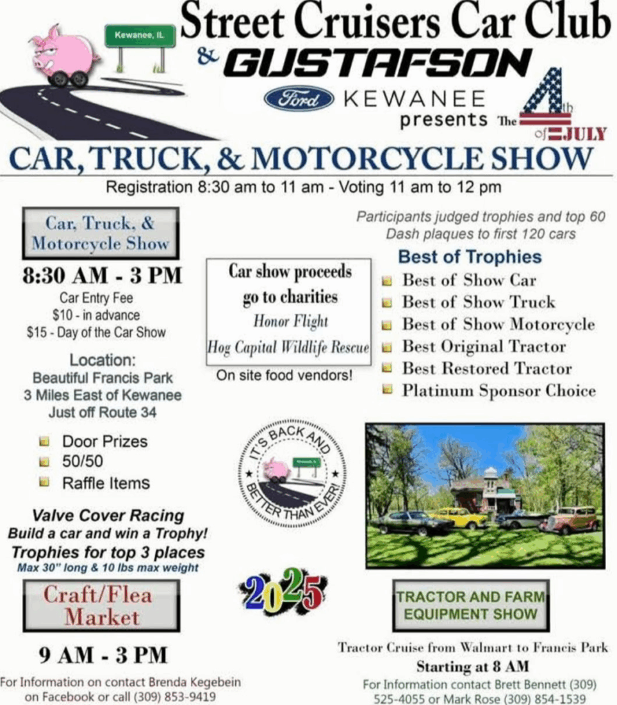 This year, the Street Cruisers Car Club and Gustafson Ford will sponsor one of the area’s largest car, truck and motorcycle shows at the park from 8:30 a.m. to 3 p.m. on the Fourth. Registration of show entrants runs from 8:30-11 a.m. and voting will be from 11 a.m. to noon.