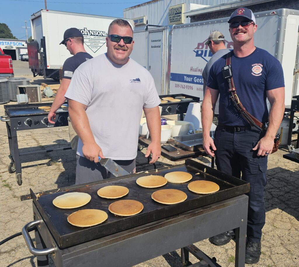 Kewanee firefighters flipped pancakes at the “Guns and Hoses” breakfast held in the Johnson Appliance parking lot on Saturday. [Photo by Susan DeVilder]
