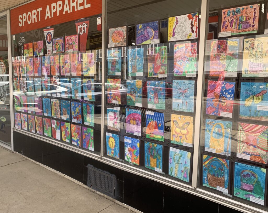 The festival organizers used the windows of local businesses downtown to display student artwork. [Photo by Mike Berry]