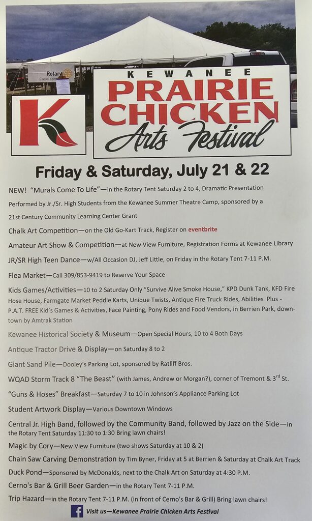 The events are free to attend. More information can be found by visiting Kewanee Prairie Chicken Arts Festival on Facebook.