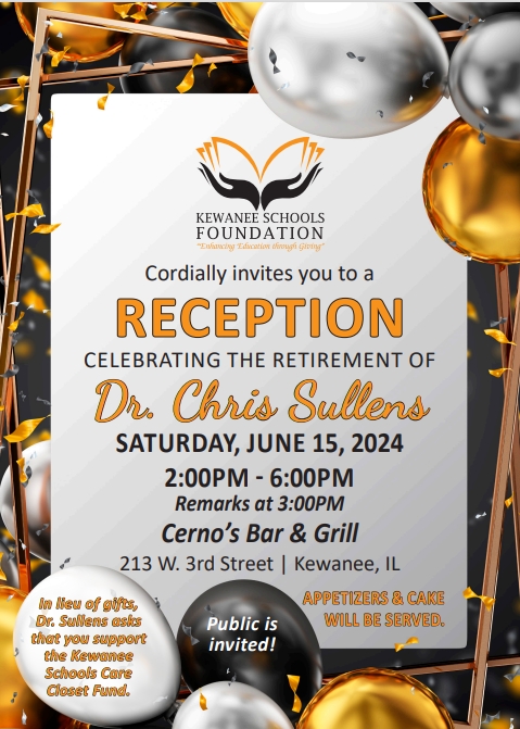 The event is sponsored by the Kewanee Schools Foundation and in lieu of gifts, Dr. Sullens is asking for support of the Kewanee Schools Care Closet Fund.