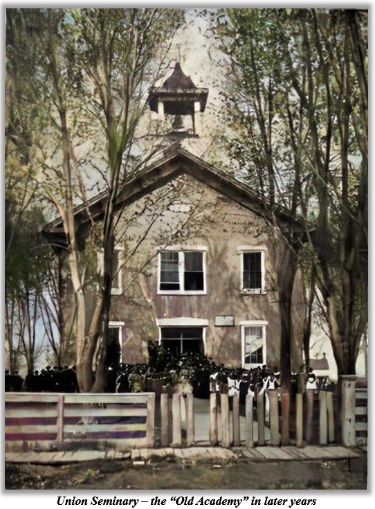 The school was officially called the Union Seminary, but eventually became known simply as the “Old Academy.” It began its first term in April 1857. Tuition ran $4.00 per quarter for common school studies and $5.00 per quarter for advanced branches and languages, with extra charges for music, drawing, and painting. The school promised the availability of nearby boarding.