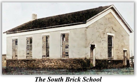 In 1850, after the Wethersfield Congregational Church built a new edifice, the school trustees moved the log school to the other side of Tenney Street and a block north on land acquired for a school campus. In 1856, the Wethersfield Baptist Church stopped construction of a building on the west side of Tenney Street between McClure and Church streets. The Wethersfield school trustees acquired the building for use as a school, later known as “the South Brick School.”