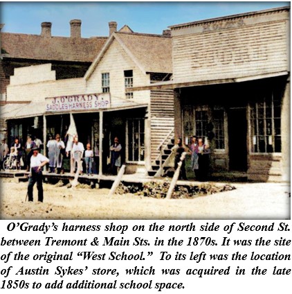 After the new West School was occupied, the W. R. Goodrich-built structure was acquired by James O’Grady for his wagon and harness shop business. Sykes’ former building was acquired by Elias Lyman and Hiram T. Lay, the owners of the “5 or 8 Store” on Tremont, for use as a grocery store. Shriver’s Philadelphia Store later moved to the corner of Tremont and Third streets. There were no more schools in what was the original village.