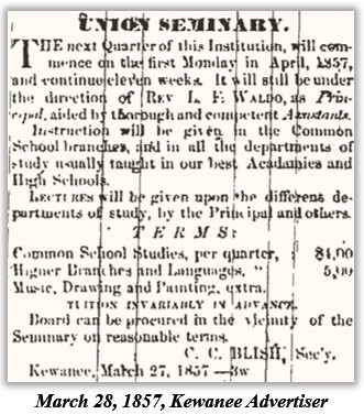 Also in 1858, the trustees sold the old one-room school building on Elm Street and replaced with a new two-room school on the same site. (That old Morse building was moved again to the southwest corner of Tremont and Third streets where it served as the office of the newspaper, “The Henry County Dial.” It later was moved once more, to be used as a church and then as a dwelling.) Meanwhile, Kewanee and Wethersfield did not neglect education beyond the elementary level.