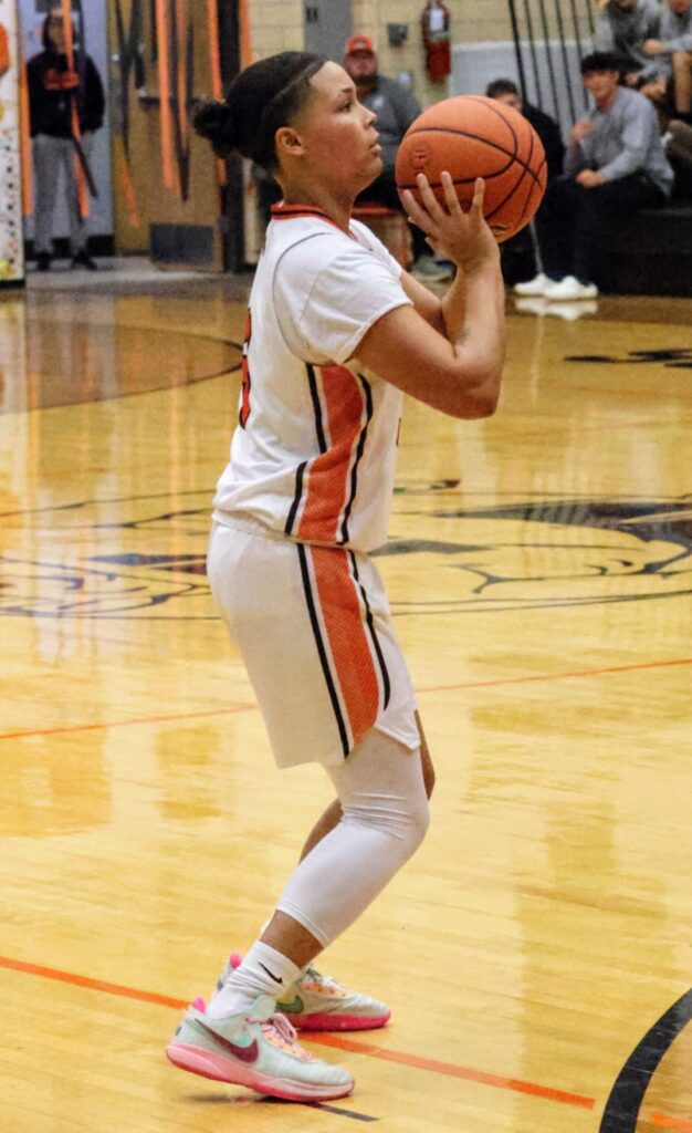 Mya Dearing lines up a 3-point shot Thursday against the Hall Red Devils. [Photo by Dillon Price of The Kewanee Voice Student Journalism Program]