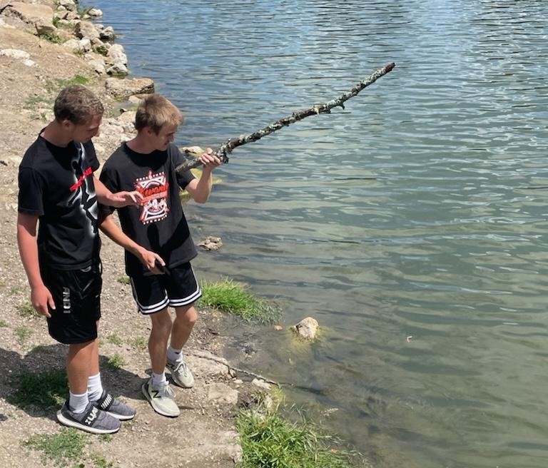 Campers Trenton and Korbin tested out their handmade fishing poles at Windmont during day camp. [Photo by Elle Eastman]