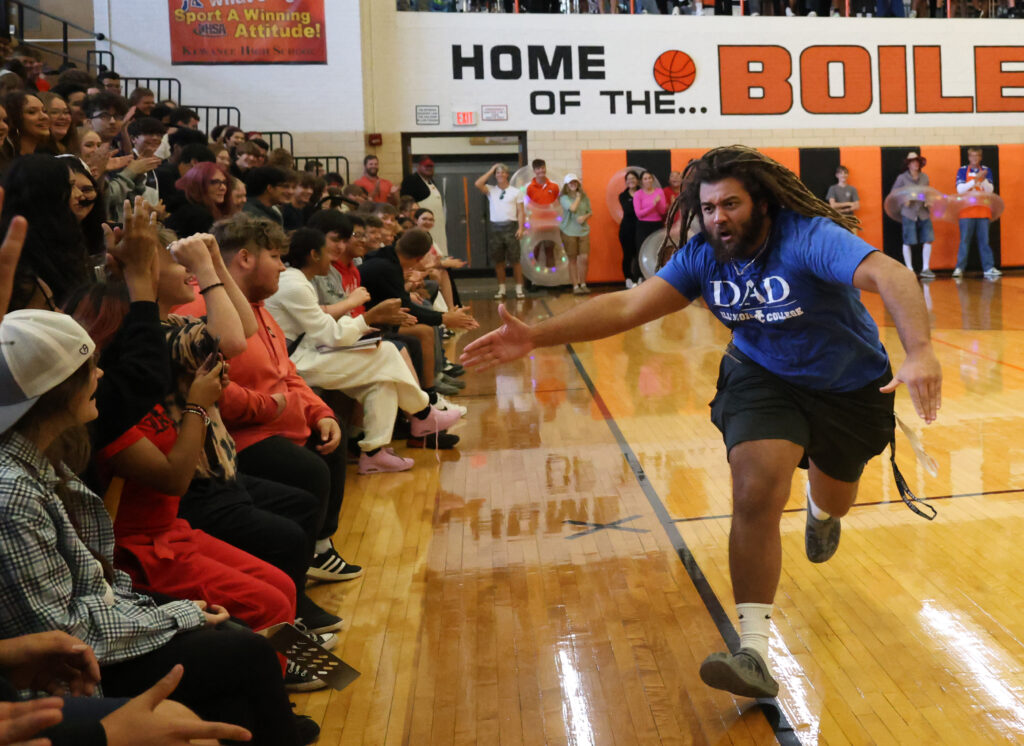 Students ran a relay race; fellow teachers and brothers Trenton Terry and Willie Terry III faced off in a 1-1 game of basketball; teachers and students participated in a game of musical chairs and the KHS poms team performed with many students dressed in the day’s homecoming theme of barbecue dads or yoga moms.