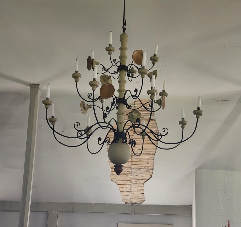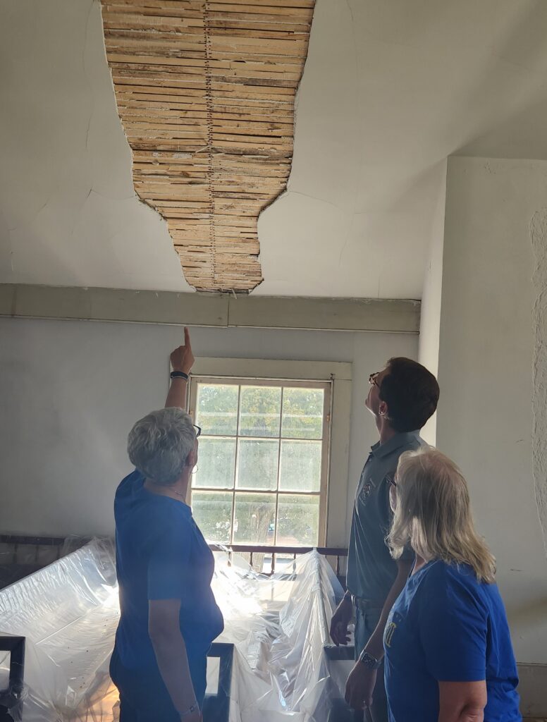 It is still visited by many and features a candlelight celebration on Christmas morning, hosts weddings and is a big draw for tourists. Krause pointed to the damaged foundation, gutters and window sills and took the group to the second story to see the broken plaster and exposed lathe just above the original pews and flooring.