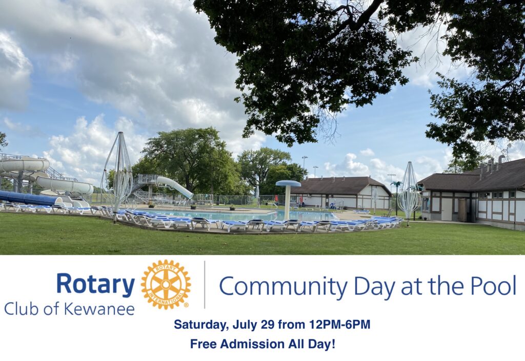 The Rotary Club of Kewanee and Kewanee Park District announced the second annual “Rotary Community Day at the Pool.” The event is set July 29 from noon to 6 pm at the Oasis Family Aquatic Center in Kewanee. Admission to the pool will be free for the day and paid for by the Rotary Club of Kewanee.
