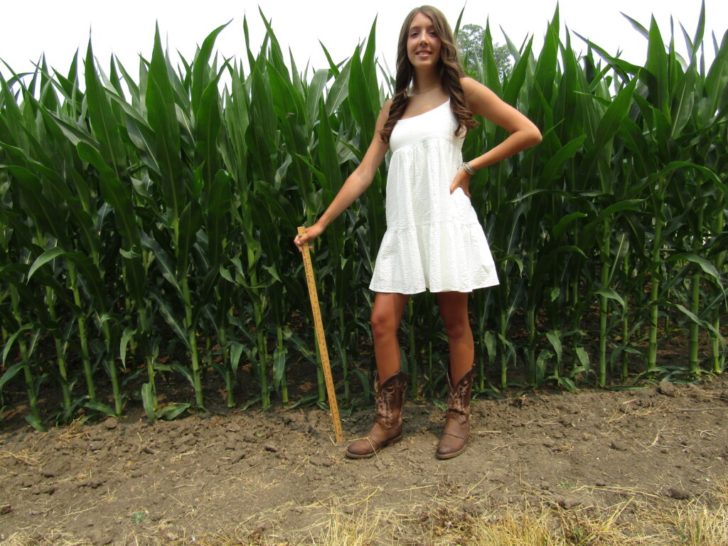 We found one of those fields when we ventured out to measure the stalks with this year’s “Knee High by the Fourth of July Girl,” Brooklyn Schiltz, of rural Kewanee. She took us to one of her grandfathers, Ron Schiltz’ fields on the east edge of Kewanee on June 27. The field was planted April 28. The tape measured one of the plants as 6 feet 1 inch tall from the tip of a leaf to the roots at the ground alongside Brooklyn at 5 feet 7 inches tall.