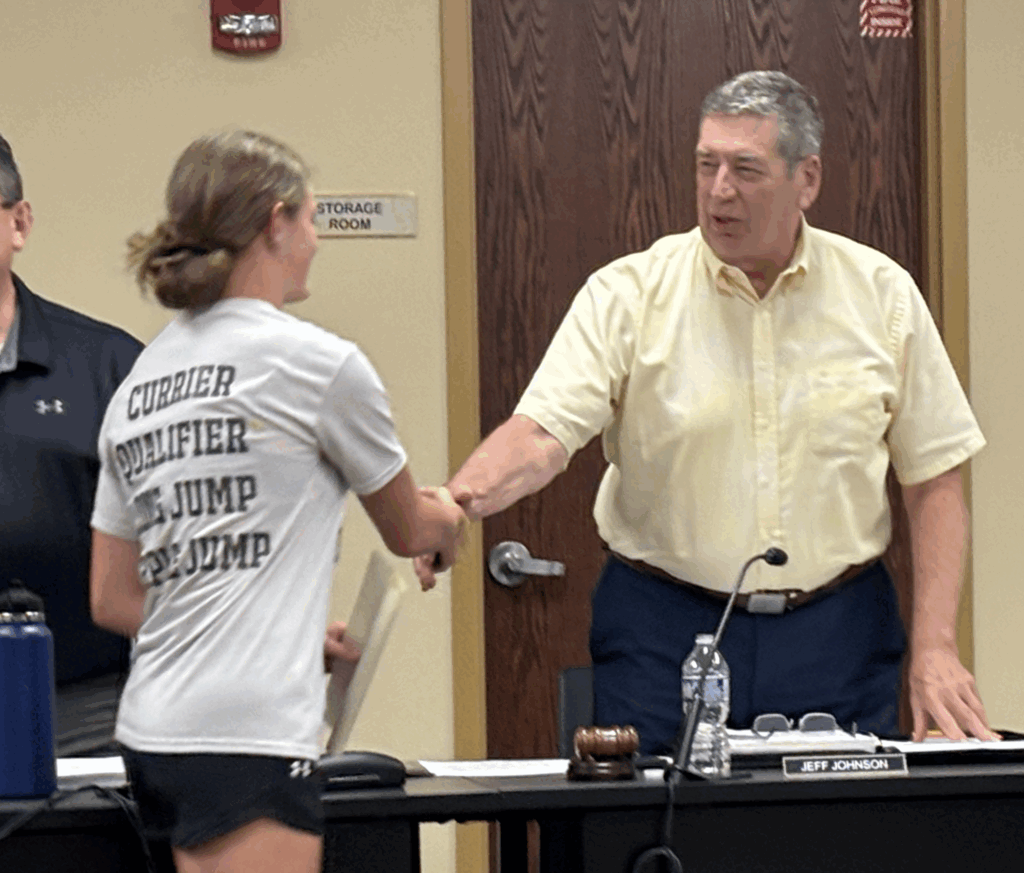 Kewanee High School athletes Jendayia Crowe (top photo) and Danielle Jo Currier were honored at Monday’s Kewanee School Board meeting for qualifying for the girls state track meet. [Photos by Michael Berry]