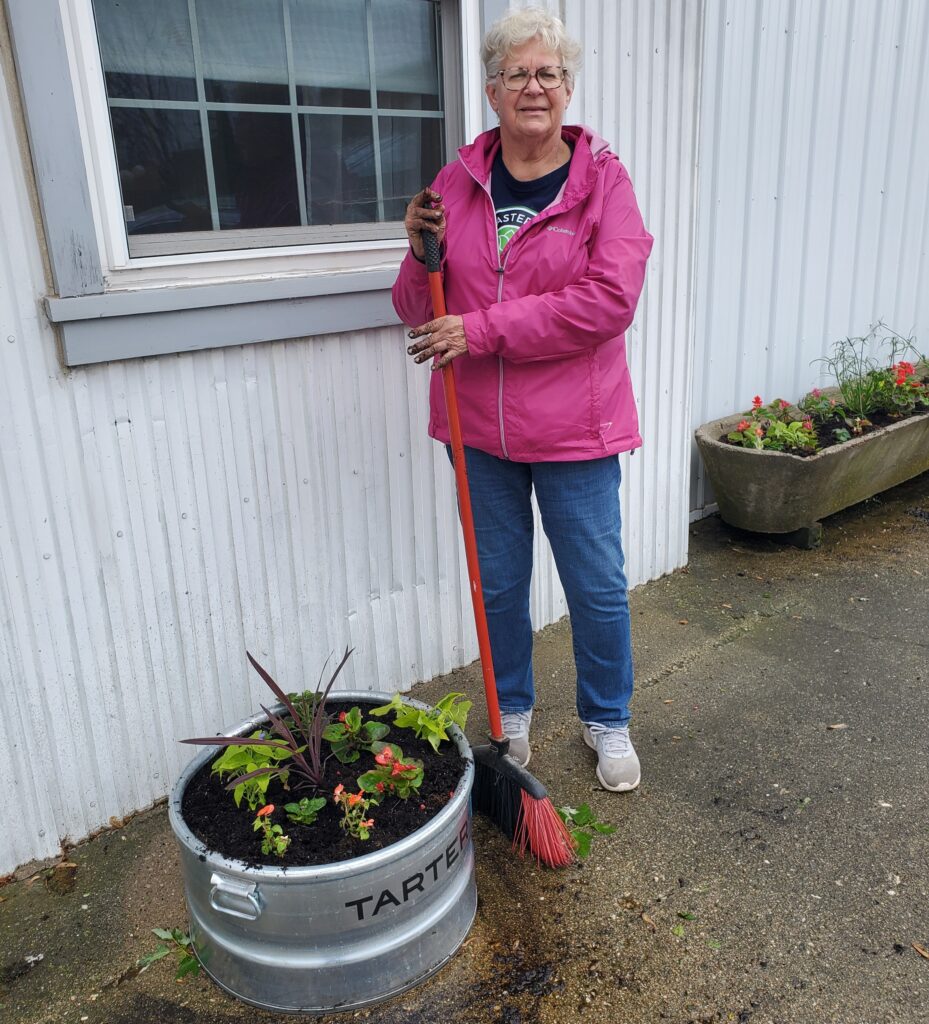 Gail Pickering has been carrying out this project for several years. It started when she and her fourth grade students made a butterfly garden at the grade school. From there it expanded to Commercial Street. Besides that, on her own, Gale plans and plants several other spots in town, including the public library. She maintains them all summer, watering them from a tank in her pick-up truck.