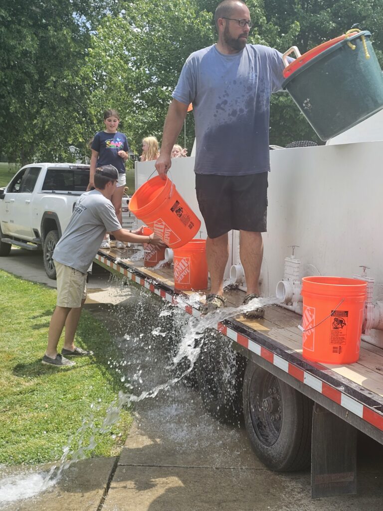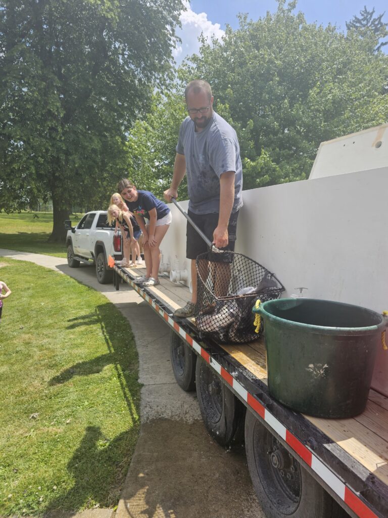 There is a process to offload the fish into the water, explained Nate Herman. The water temperature in the tanks used to transport the fish is 60 degrees. The pond water is much warmer at around 80 degrees. In order to ensure the fish aren’t shocked, half of the water is released from the truck’s tanks and replaced with pond water. Buckets are used to scoop water out of the pond and into the tanks. The entire process takes about a half-hour.