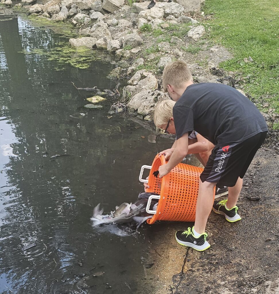 Once the water was replaced and the fish were acclimated, the real fun began. Using eager volunteers, Herman netted the fish and placed them in baskets. Volunteers carefully carried the baskets of fish down the boat ramp before giving them a sendoff into the pond. In all, 12 compartments of fish were emptied.