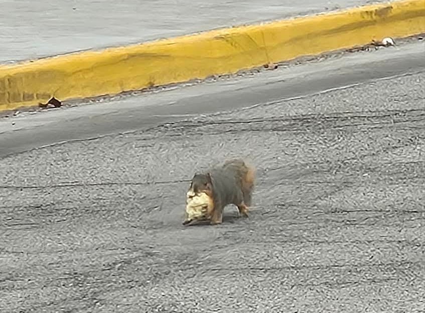 For the next several minutes, Hernandez watched as the squirrel dragged the muffin a few feet before stopping to take a few nibbles. The squirrel repeated that behavior for several yards. So humorous was the sight that Hernandez pulled out his phone and began snapping photos.