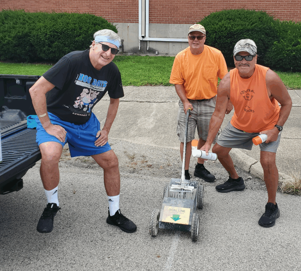 Volunteers (from left) Nelson Lay, John Patch and Jay Cone’ have outlined the course for the four-mile Hog Days Stampede. [Photo courtesy of Mark Mikenas, Kewanee Chamber of Commerce executive director]
