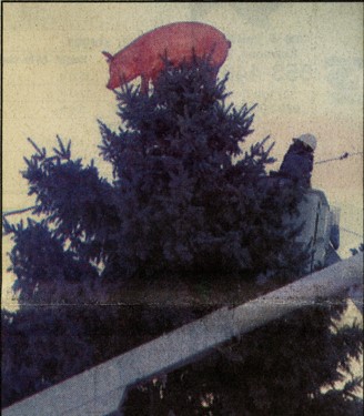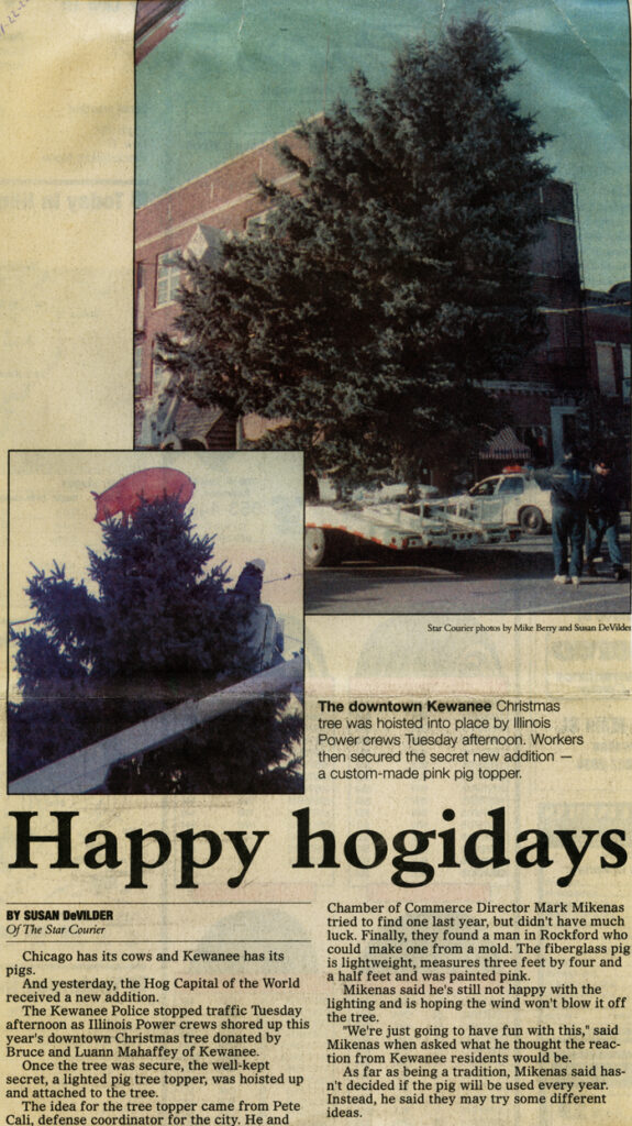 “A well-intended plan that put a life-sized plastic pig on top of a 40-foot Christmas tree in the heart of downtown Kewanee to brighten the spirits of holiday shoppers went horribly wrong” that year.