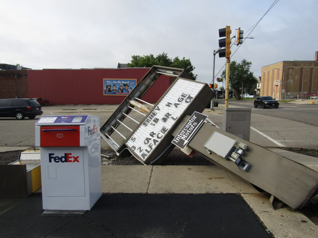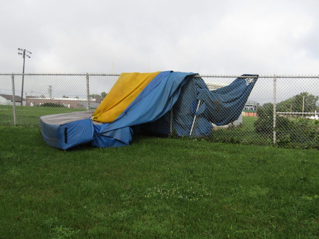 A large metal sign at Sutton & Associates Realty, at the corner of Main and First streets was toppled by the high winds. [Photo by Dave Clarke]The west end of the north building at the Four Degree Trailer Factory (formerly Advance Metalworking Co.), on Routes 34/78, south of Kewanee, was hit by high winds Monday night lifting an addition off its foundation and collapsing a portion of the roof. A large billboard half a mile north of the plant was ripped to shreds. [Photo by Dave Clarke]A portion of large tree at the entrance to Wethersfield Elementary School fell into Willard Street. [Photo by Dave Clarke]The cover of the pole vault pit at the west end of the Wethersfield High School athletic field was blown across the full length of the field and stopped by the fence at the east end, along Willard Street. The pit was carried to approximately the 30-yard line on the west side of the football field. [Photo by Dave Clarke]Left: A home on Prospect Street is buried by tree limbs that have fallen onto both the west and north sides of the home. A huge branch balances on the roof of a home on East and Prospect streets. [Photo by Susan DeVilder]A trampoline caught in fallen branches and power lines blocks the entire roadway on East Street. [Photo by Susan DeVilder]