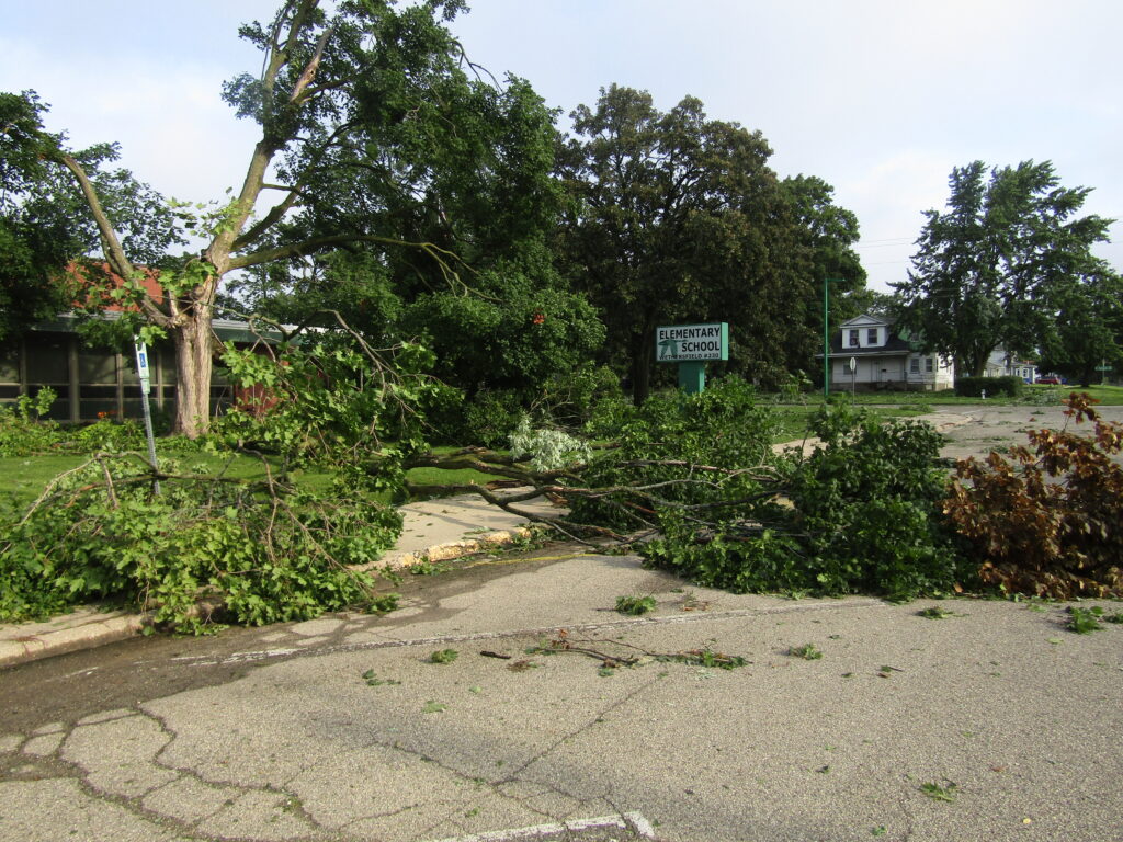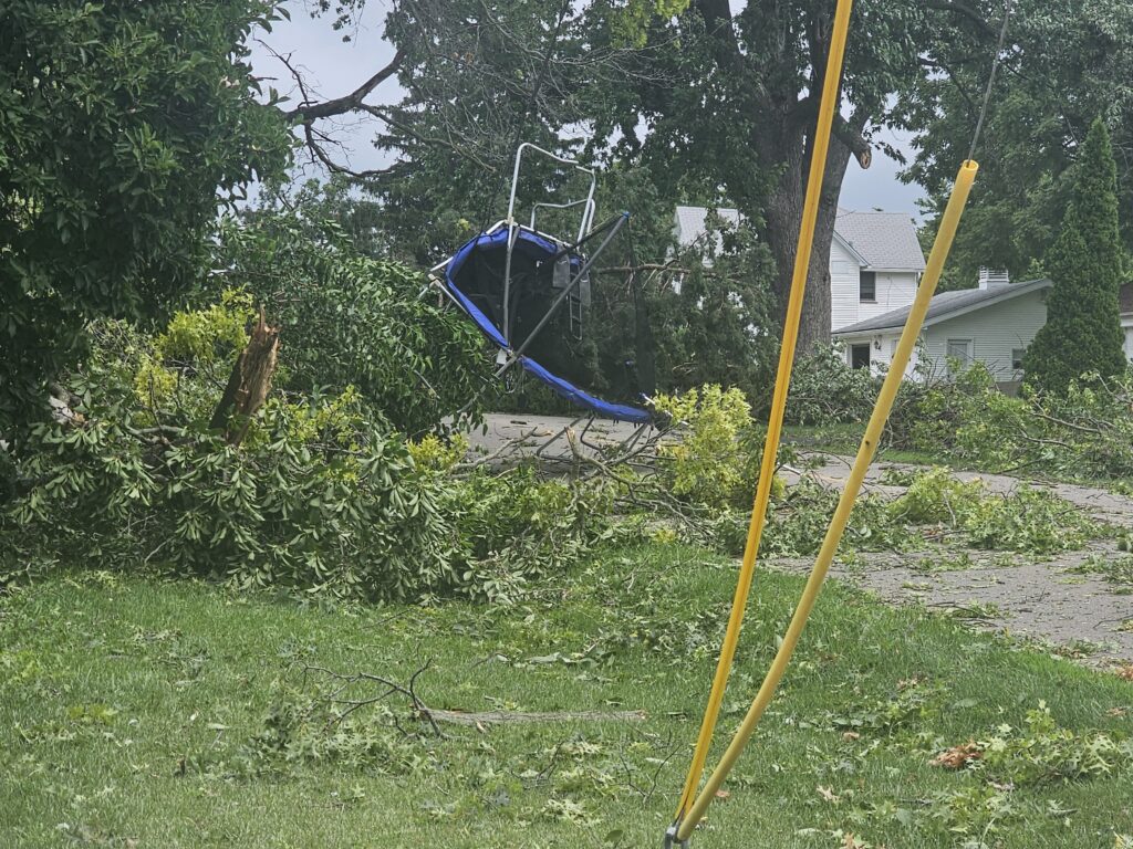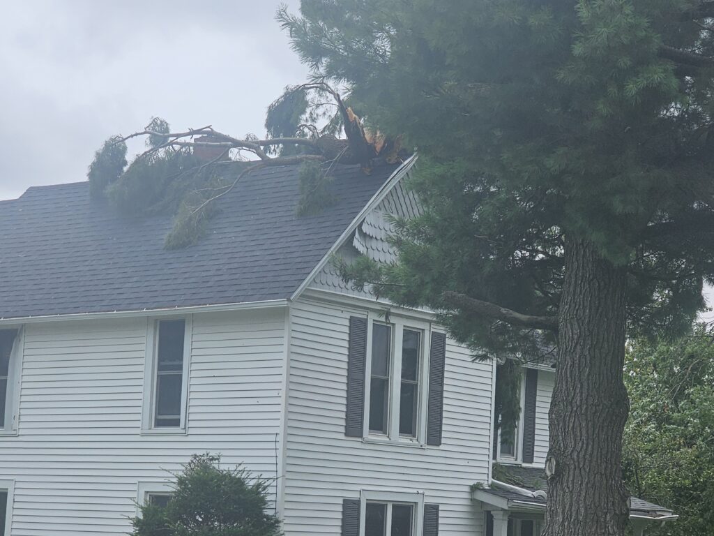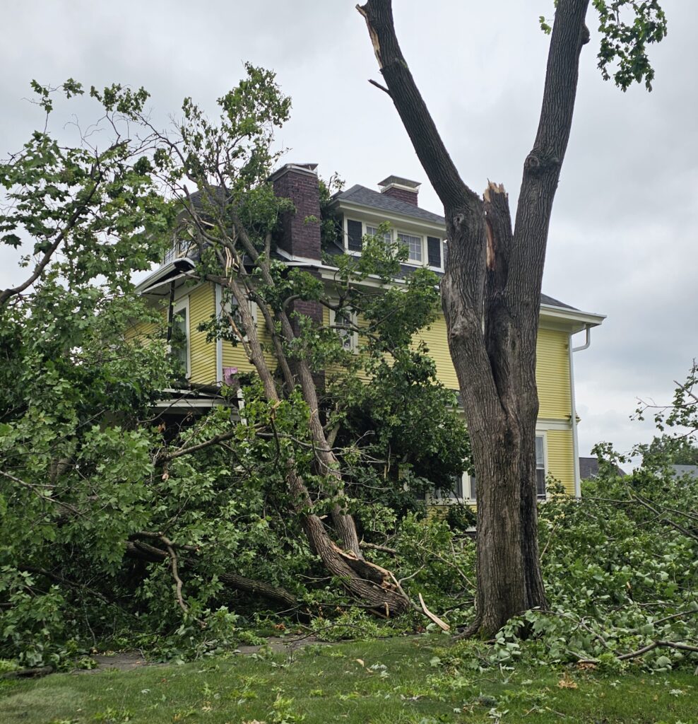 At East and Prospect streets, a trampoline caught in fallen tree limbs had become entangled in power lines and remains in the roadway, cutting off traffic. Over a few blocks, high winds had split a tree asunder, with half falling into a resident’s yard. On Vine Street, a large tree branch had fallen onto a porch roof, collapsing it.