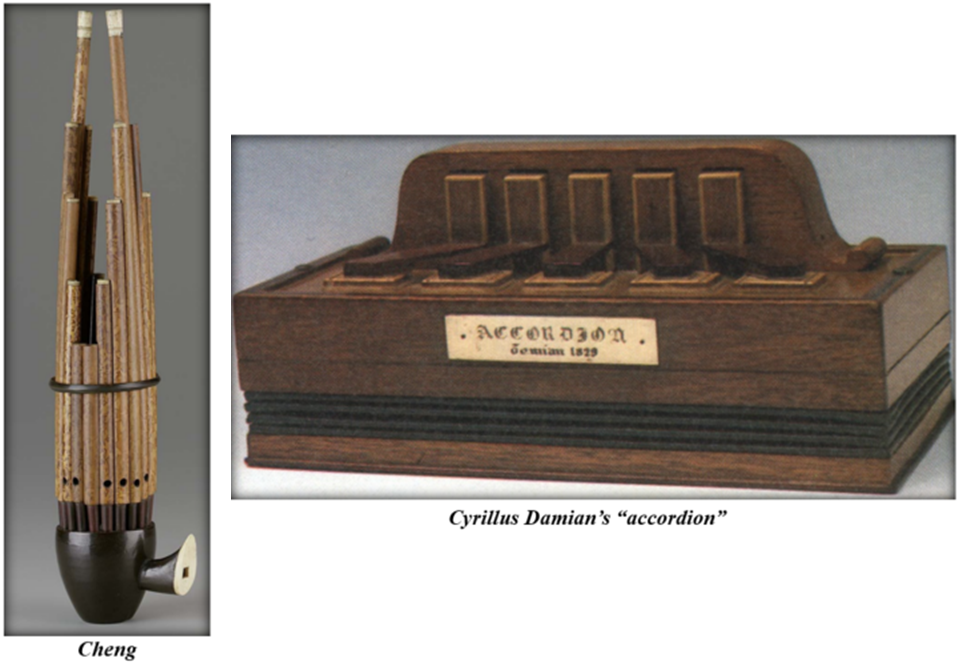 About 5,000 years ago, the Chinese developed the “cheng,” the first known instrument using a free vibrating reed to create sound. It was introduced to Europeans in the late 18th century.
