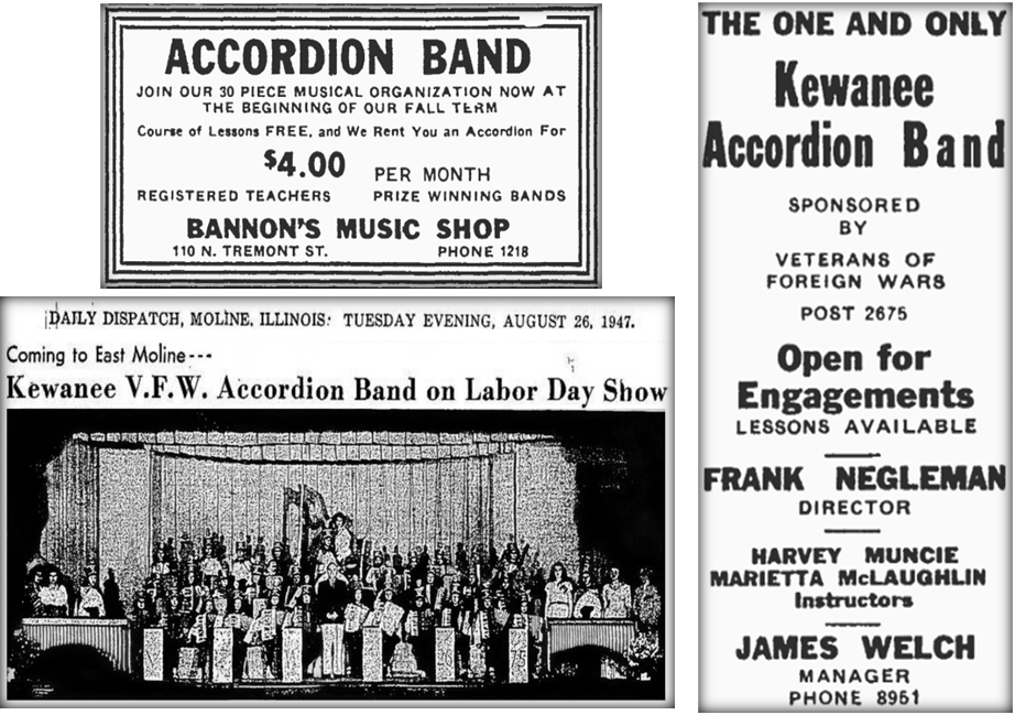 In 1949, Frank Neggelman of Peoria was named director of the band. The April 9, 1949, Star Courier described him as an “outstanding musician in this part of the state. Known as the ‘King of the Accordion,’ he has broadcast radio programs over major networks and has made many recordings. The VFW accordionists are planning an ambitious summer schedule, including many appearances in this part of the state.”