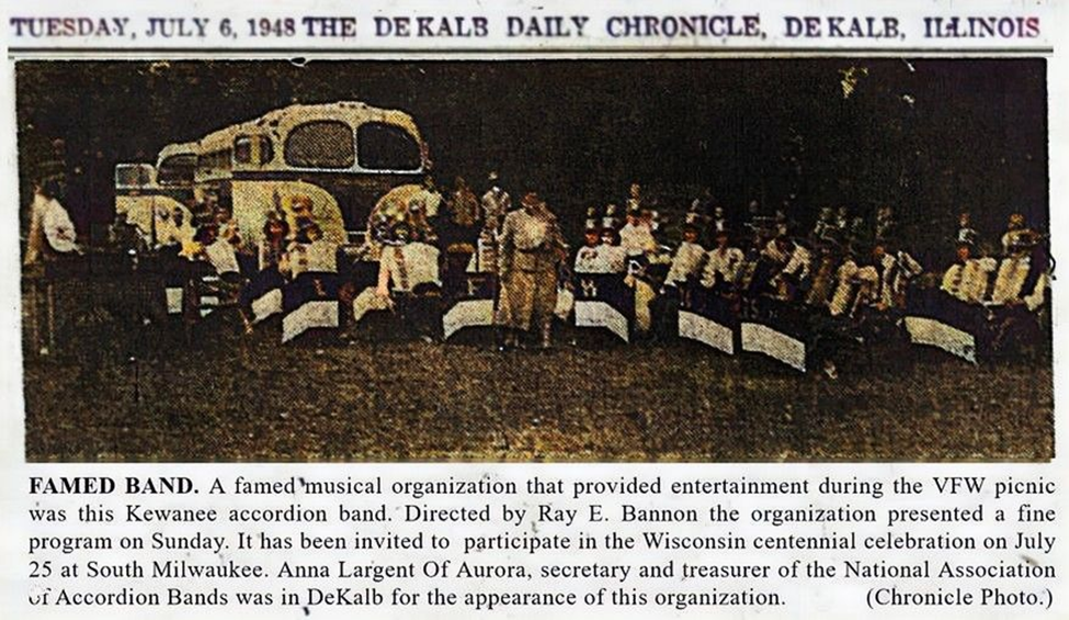 The July 23, 1940, Kewanee Star Courier, reported that a “newly organized Kewanee Accordion band under the direction of Ray E. Bannon will go to Starved Rock State Park, to participate in the elaborate Accordion Festival to be held there Aug 4,” where it would play along with 14 other bands and in front of an expected audience in excess of 25,000 people. It was the first public appearance for the 30-plus member band which had been organized six weeks earlier by Bannon, owner of the Bannon Music Shop on Tremont Street.
