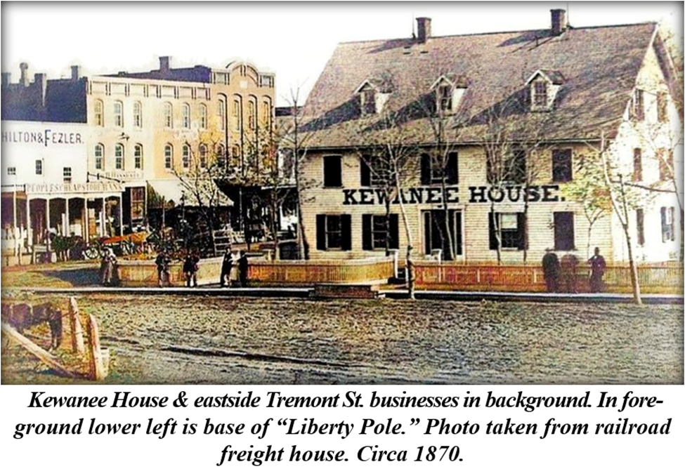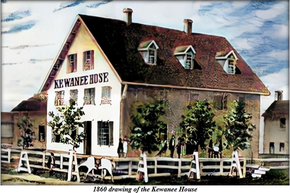 One of the first buildings raised in our hometown was a hotel to house the anticipated guests arriving on the trains of the Central Military Tract Railroad. While track had yet to be laid, the line had been graded and a location for a depot had been selected. The hotel would sit opposite the depot, the first sight passengers would see disembarking in the new village. It would simply be called the Kewanee House.