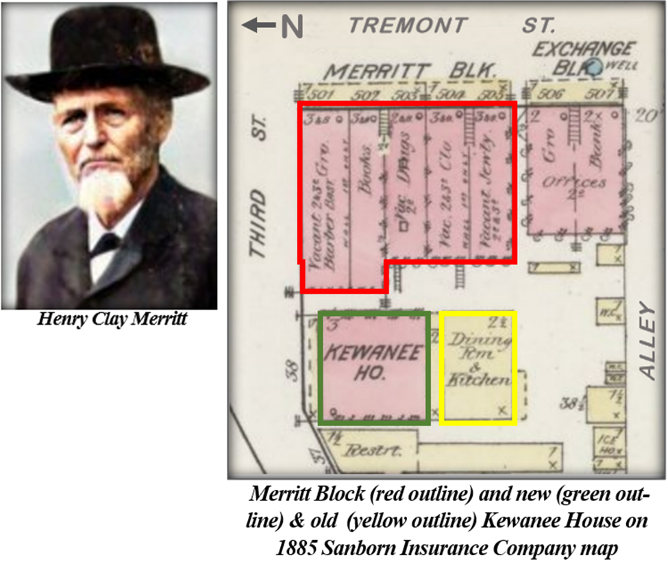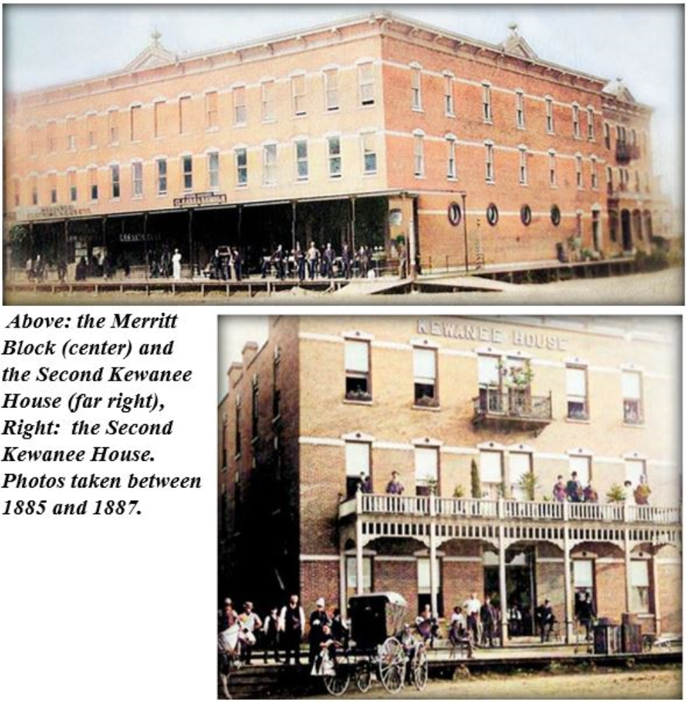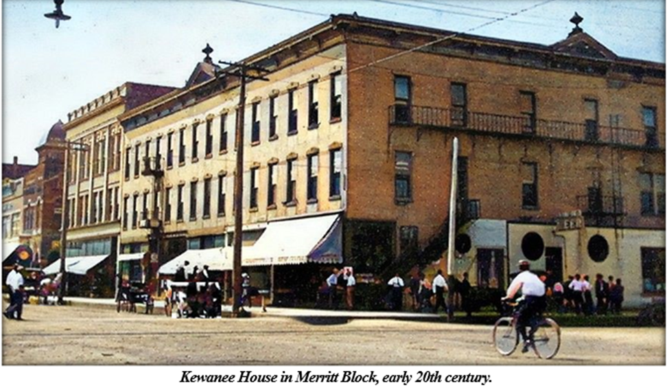 Merritt immediately made plans for a three-story, brick commercial building on the southwest corner of Tremont and Third Sts., where the old Kewanee House stood. That old frame hotel would be moved to the back of the lot to the west and a new, three-story brick hotel would be built in front of the relocated old hotel. The new hotel would also be called the Kewanee House. The new and old hotel would be connected, with the old hotel housing a dining room, kitchen, and storage.
