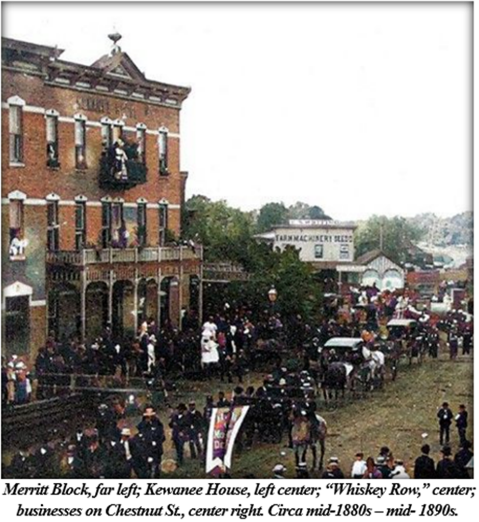 The new buildings opened the following year, and each was highly successful. The “Merritt Block” housed a multitude of businesses, while the hotel added a modern respite for visitors to Kewanee, as well as a saloon. There were now other hotels in the growing city. But the Kewanee House, conveniently located across from the train depot, adjacent to the main shopping on Tremont, kitty-corner from the city hall, and at the east side of “Whiskey Row,” was still the prominent location for out-of-town visitors, as well as for special events.