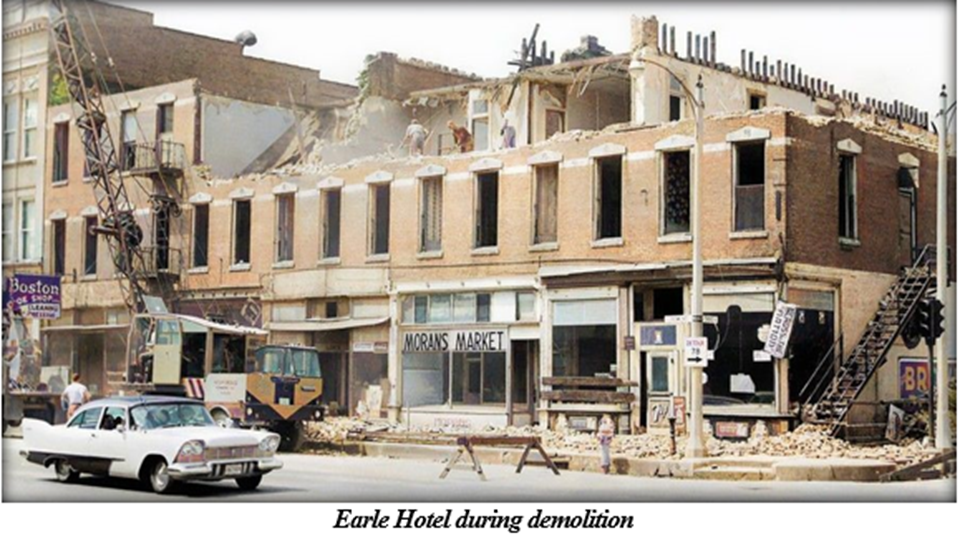 In 1919, new ownership took over the hotel and renamed it the Wilson Hotel. Later, another change in ownership led to another change in name, to the Earle Hotel. Then, in 1958, the entire hotel was destroyed by fire and not rebuilt.