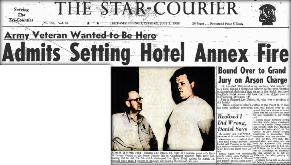 What made Dave write about Daniel was that three months after the Earle Hotel fire, Daniel was arrested by the Henry County Sheriff and subsequently confessed to setting the fire. Daniel was eventually committed to the East Moline State Hospital, later released, and ultimately had all charges against him dropped. It turned out to be a case of a “false confession,” brought about by a “ride” with the Sheriff who “helped” Daniel understand the circumstances of the case. Based on those elicited facts, the judge found the confession inadmissible.