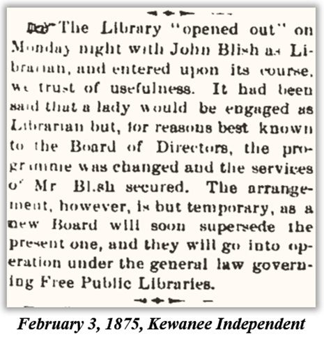 The next year, the Kewanee Library Association was formed, and on February 1, 1875, the library had its grand opening in the newly built town hall, aptly named “Library Hall.” The library, located in the northwest corner of the first floor of the building located at the northwest corner of Tremont and Third Streets, contained 262 books. The first librarian was John G. Blish, and the library was open to township residents during evenings and Sunday afternoons.