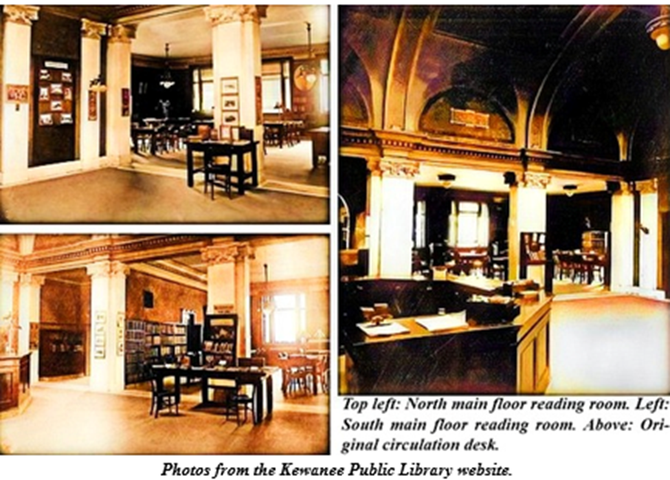 So how did the library come about? Larry Lock has written a brief history about it, which can be found at the Kewanee Historical Society, along with photos of the building. Sarah Sagmoen also has written a detailed history of the library, which can be found on the library’s website, also along with photos.
