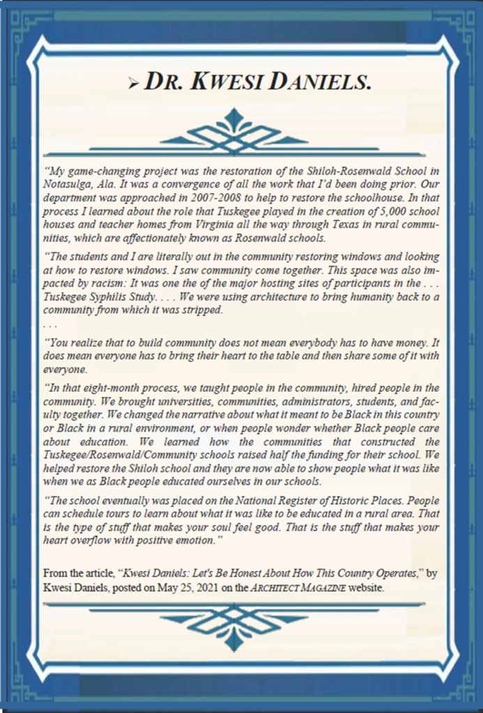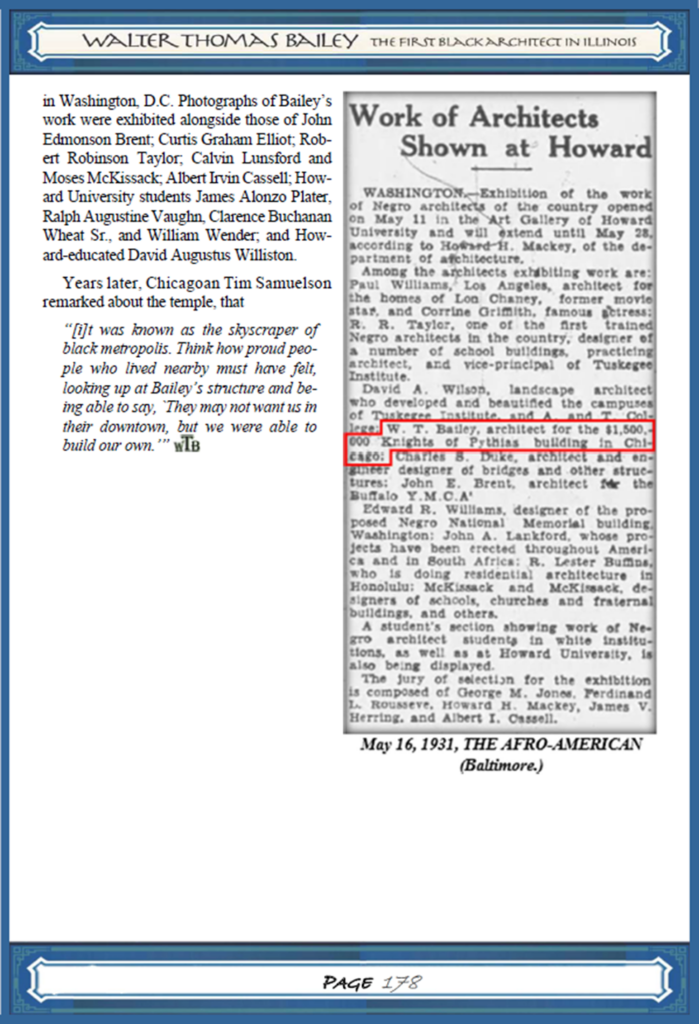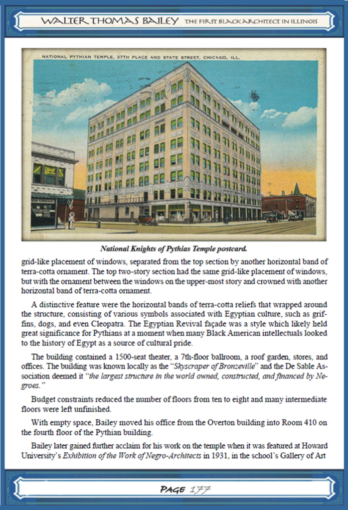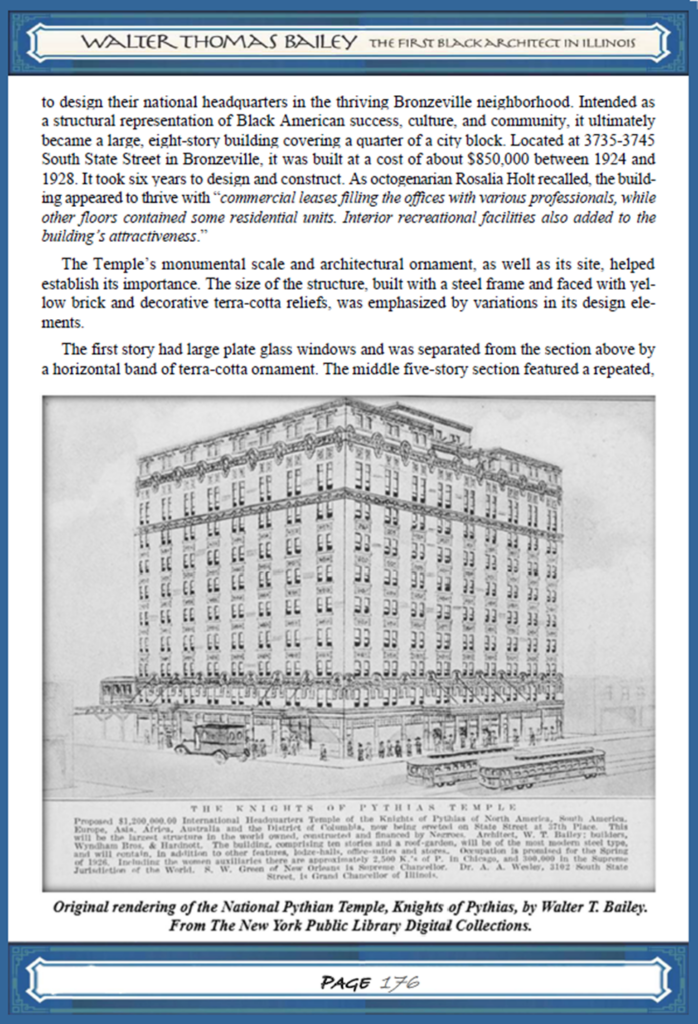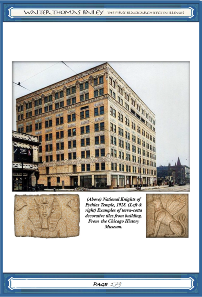 (After Walter T. Bailey taught and designed at the Tuskegee Institute for 10 years, he grew a successful private architectural practice in Memphis where he and his family lived for the next 10 years. Based on his reputation from his work produced while in Memphis, he was hired to design and supervise the construction of his most inspired and well-known work, The Knights of Pythias Temple in Chicago. Here is the chapter from my book about that project, along with more commentary from Dr. Kwesi Daniels.)