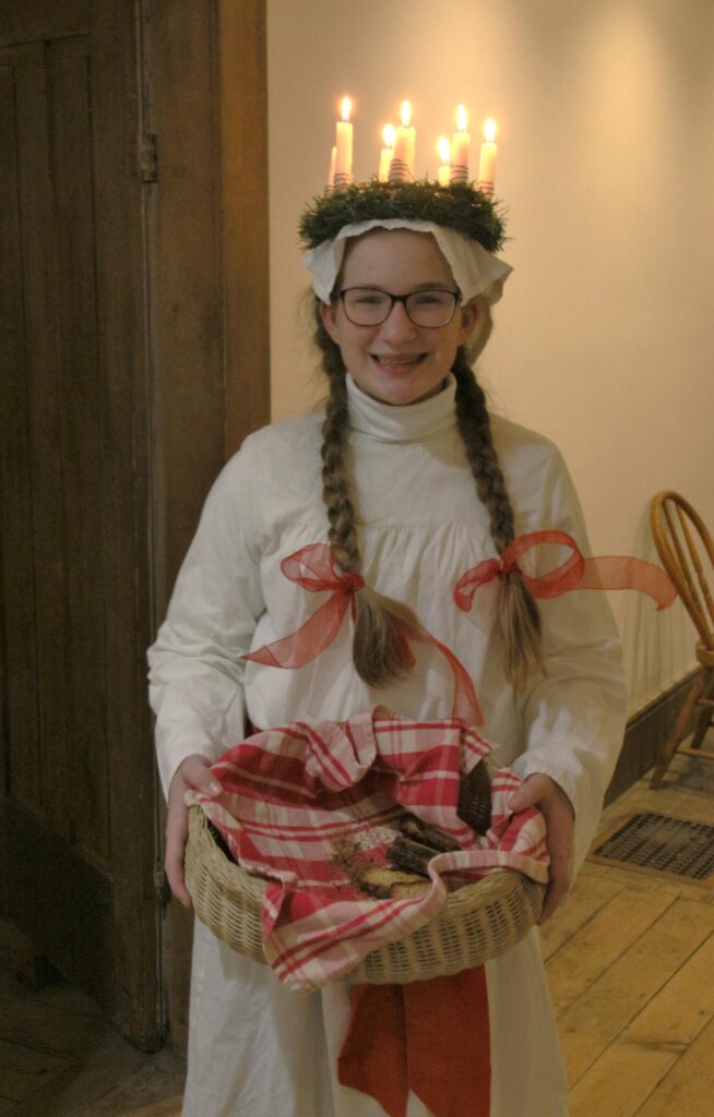 Today, girls in Sweden wake their families on Dec. 13 carrying a tray of Lucia buns while dressed in a white robe and wearing a crown of candles, and in Bishop Hill, the event, Lucia Nights, commences with the lighting of the park Christmas tree at 6 pm on Friday, Dec. 8. The public is invited to bring edible ornaments to hang on the tree.