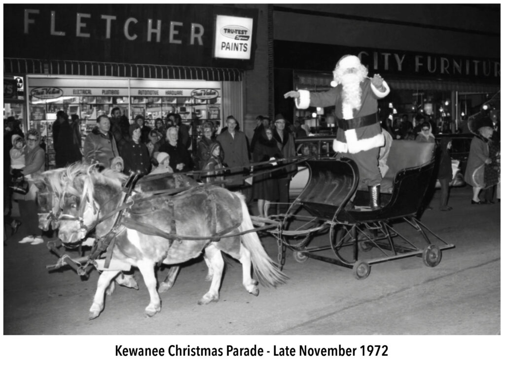 For many years there was actually a Christmas parade with bands, floats and fair queens braving the cold and sometimes snowy pre-Christmas weather. The floats often depicted various aspects of the Nativity and were sponsored by local churches. The events were sponsored over the years by the Jaycees, Lions Club and Kewanee Chamber of Commerce.