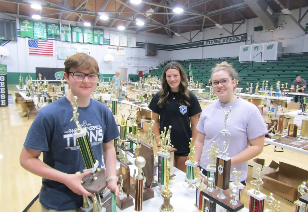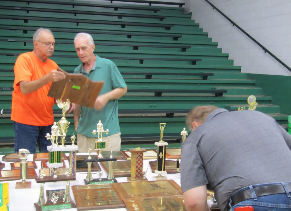 The floor of Wethersfield High School gymnasium was covered Sunday with tables full of trophies and plaques in a sale that coincided with the alumni meeting to raise funds for scholarships. The public was invited to view the array and take as many home as they wanted in exchange for a donation. By the end of the day, 65 items had been taken and $420 raised. Adding trophies, plaques and banners “rehomed” to people with a connection to them prior to the sale put the total number “rescued” at 82.