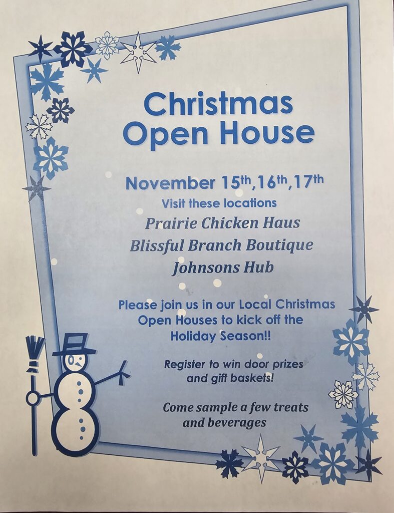 Prairie Chicken Haus, Blissful Branch Boutique and Johnson Hub will kick off the Christmas season with door prizes, gift baskets and refreshments.