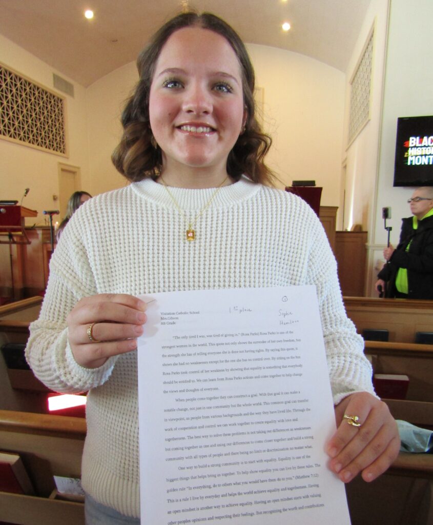 Winners of a Black History Month Essay Contest for fourth through sixth graders and seventh and eighth graders read their essays. Winners in the fourth through sixth grade were Summer Van Winkle, a sixth grader at Visitation, first, and Kamdyn Powell, a sixth grader at Central, second.